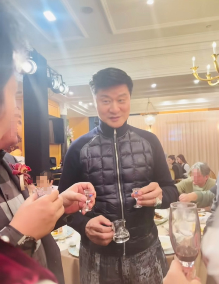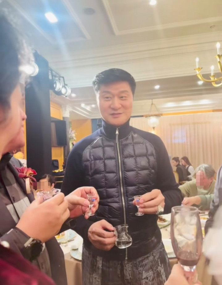 他一只手拿着酒壶,一只手拿着小酒杯,一边跟人寒暄,一边敬酒。这期间,他站姿笔直,笑容满面,气质儒雅。