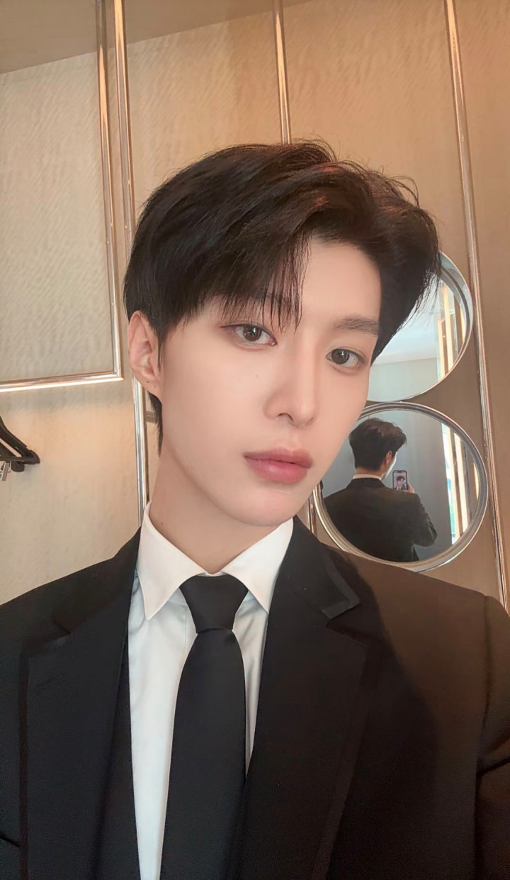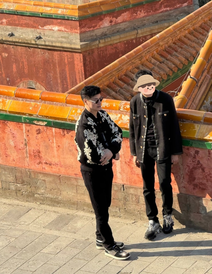 他或黑色T搭配绣花黑色外套和黑色裤,脚穿黑色皮鞋,与一旁的年轻男子同框,看不出明显的年龄差。