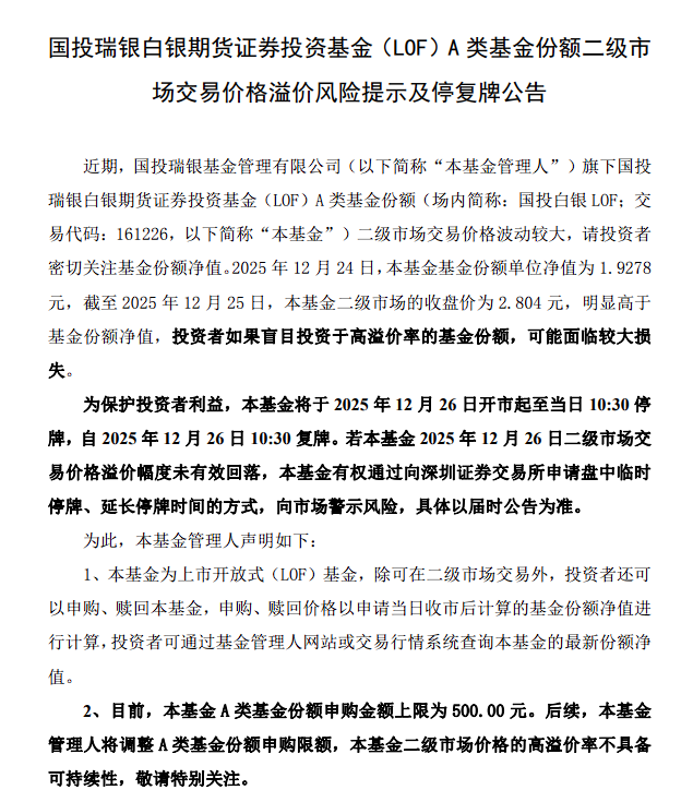 12月25日晚间,国投白银LOF发布公告称将于26日开盘起至10:30停牌后复牌,并警示二级市场交易价格存在明显溢价风险。截至12月25日,该基金二级市场收盘价为2.804元,较12月24日的基金份额单位净值1.9278元高出45%。
